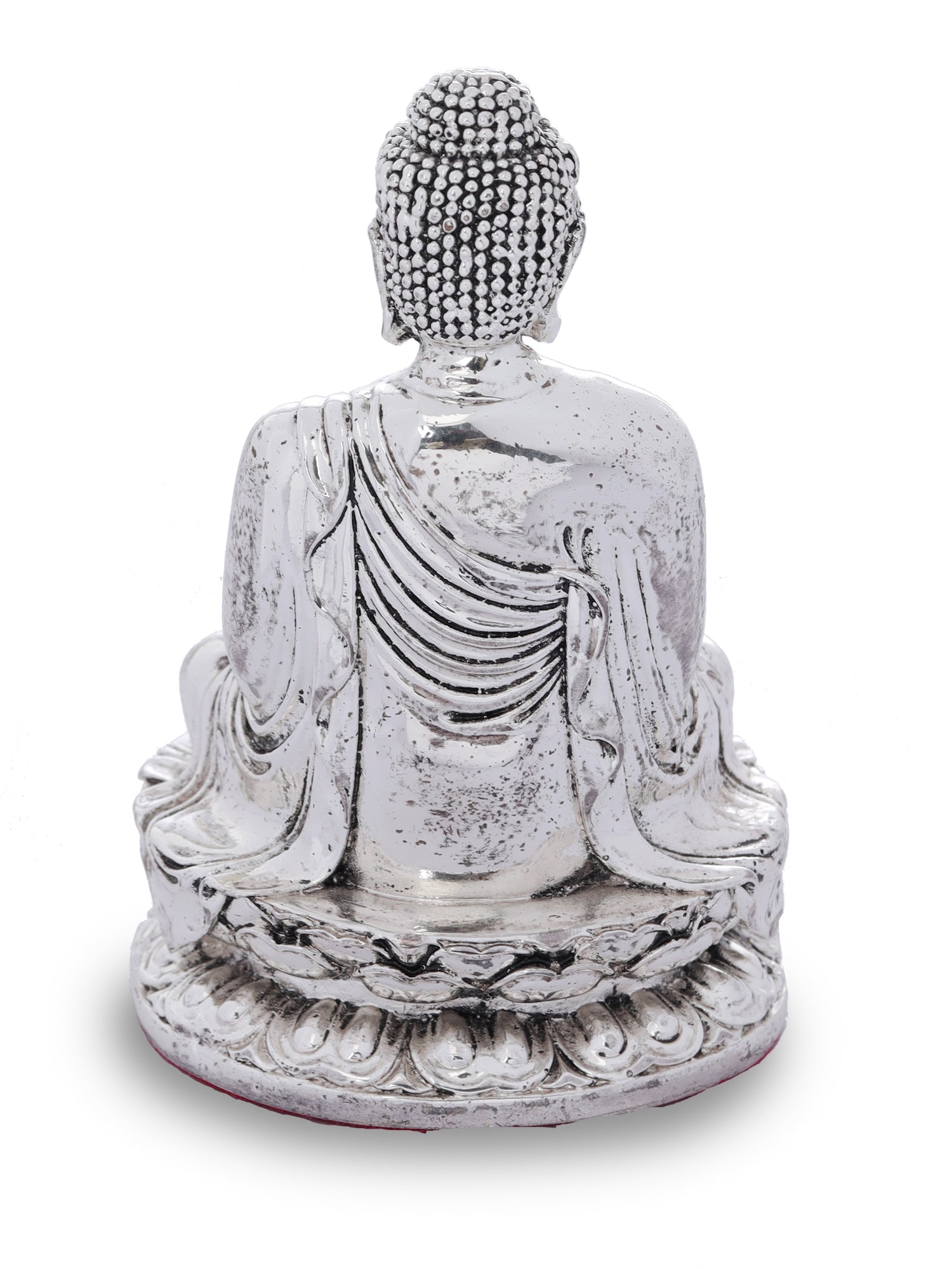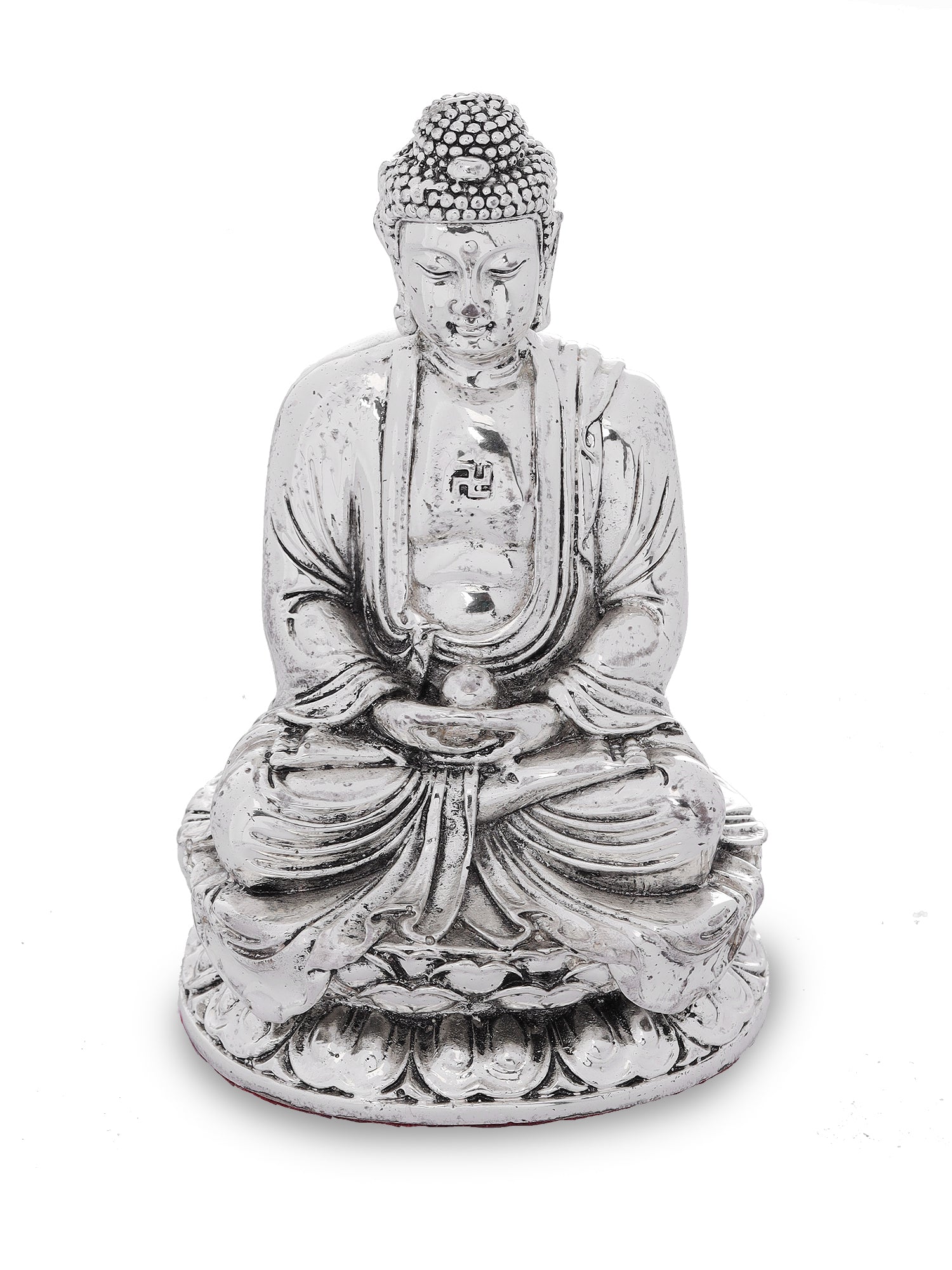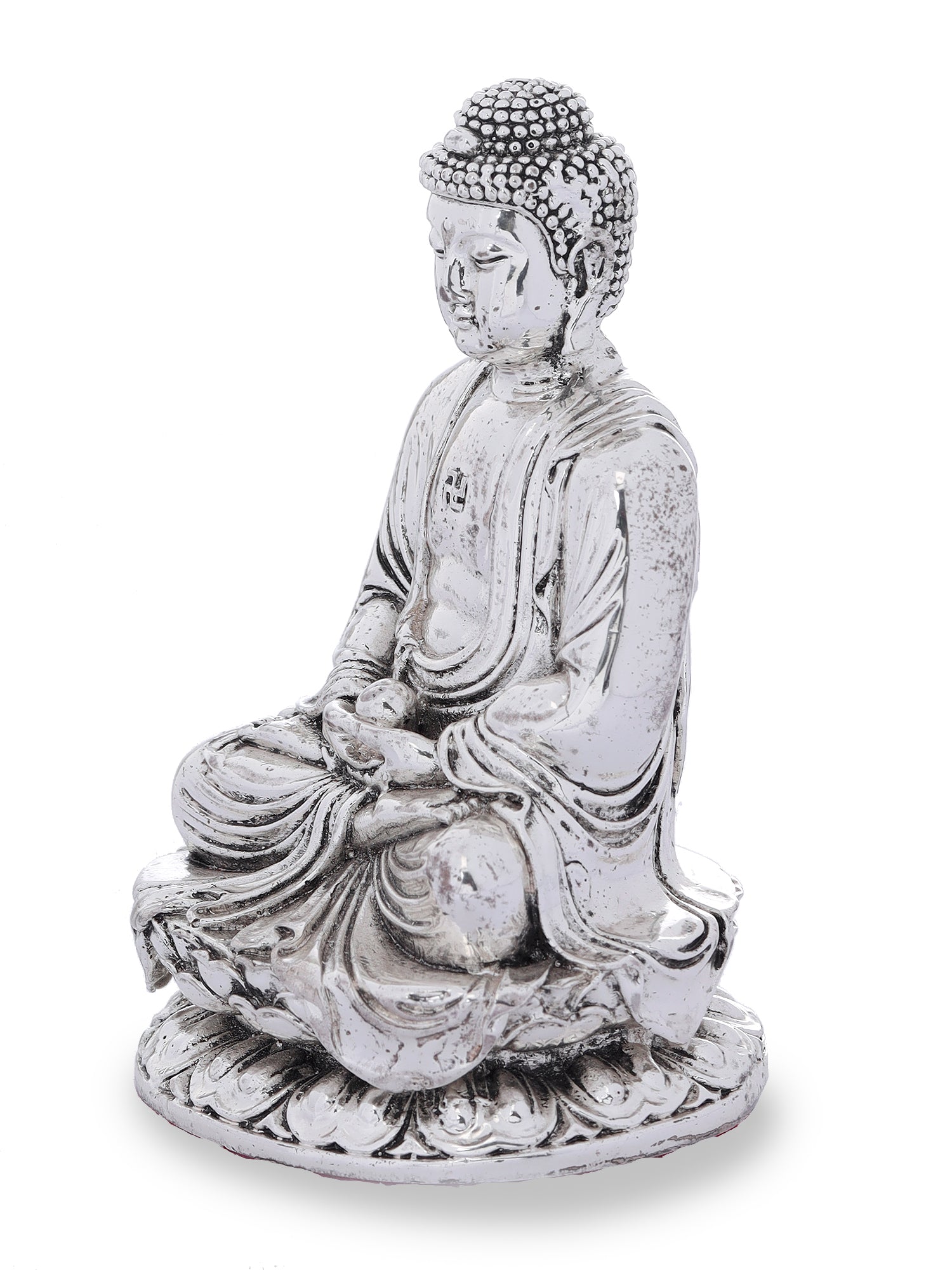 This Buddha figure is made from high-quality silver plating and resin material, perfect for adding serenity and tranquility to any space. With a sitting position, this Buddha is a symbol of enlightenment and inner peace. Bring a touch of spirituality into your home or office with this finely crafted piece.