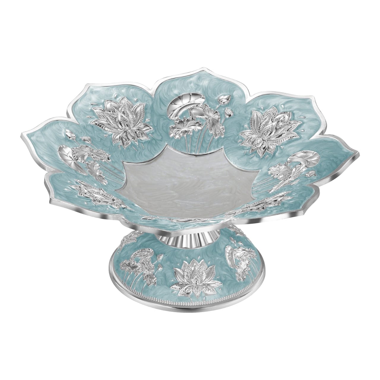 Add a luxurious accent to your home décor with this Ornamental Silver & Lavender Fruit Platter. Featuring a stunning blue enamel base with silver floral embossing, this bowl blends vintage charm with regal elegance. The scalloped edges and intricate patterns make it a standout piece—ideal for use as a centerpiece, fruit platter, or festive gift.