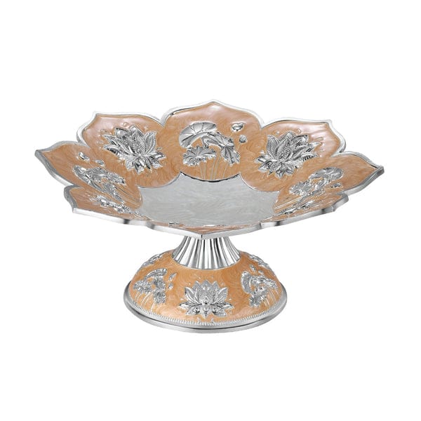 Add a luxurious accent to your home décor with this Ornamental Silver & Lavender Fruit Platter. Featuring a stunning peach enamel base with silver floral embossing, this bowl blends vintage charm with regal elegance. The scalloped edges and intricate patterns make it a standout piece—ideal for use as a centerpiece, fruit platter, or festive gift.