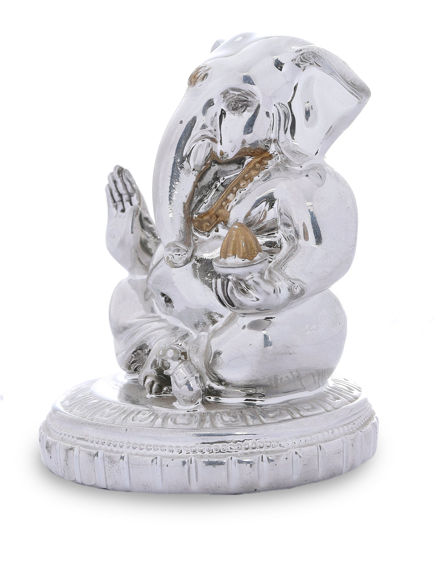 Expertly crafted with silver plating on a resin base, this Ganesh figurine is a beautiful addition to any space. The vibrant yellow laddu adds a touch of color and tradition to the piece, making it a unique and auspicious decor item. Bring blessings and prosperity with this Ganesh statue.